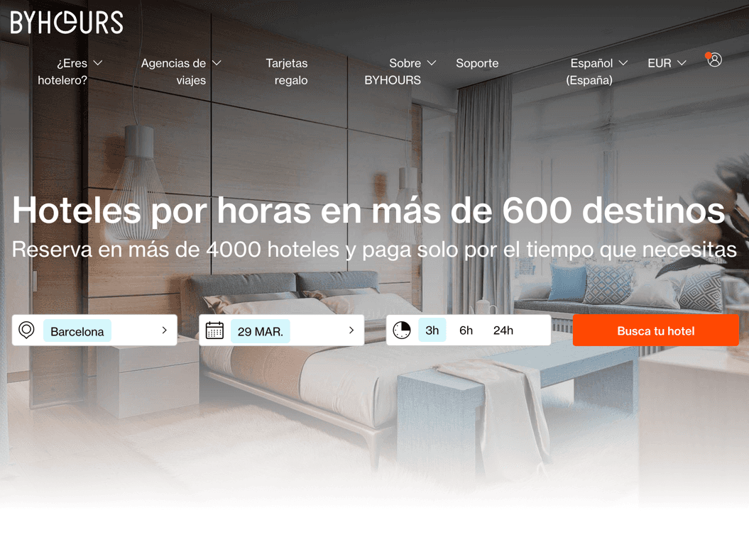 A través de ByHours, podemos reservar estancias de corta duración en hoteles durante tres, seis o doce horas. Solo pagamos por el tiempo que necesitamos, por lo que es una magnífica opción para los viajeros que quieren descansar entre paradas cortas o celebrar ocasiones especiales de forma flexible.